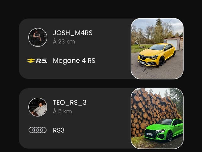 Grâce au système de match et de croisement, tu peux rencontrer d’autres passionnés, discuter et partager des moments de conduite ensemble. Le système de match te permet de découvrir des profils dans une zone de recherche proche de chez toi. De plus, l'historique des croisements enregistre toutes tes rencontres avec les passionnés qui utilisent également l'application.